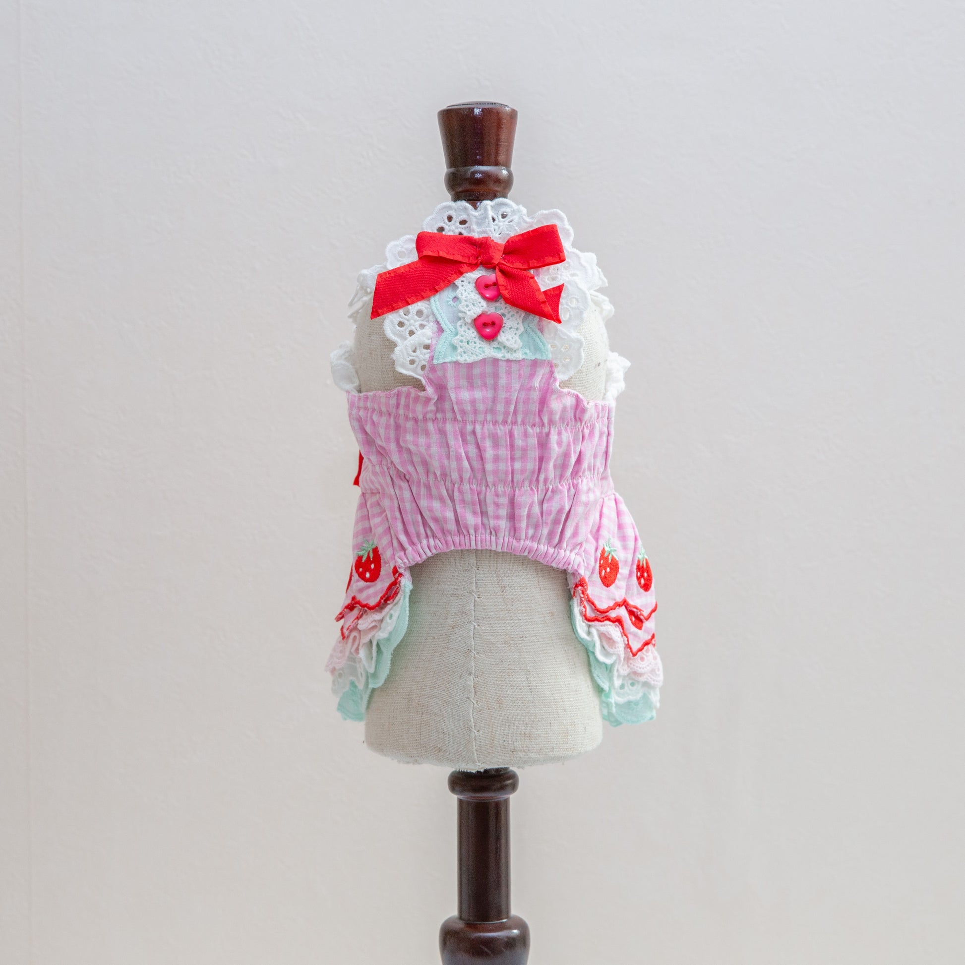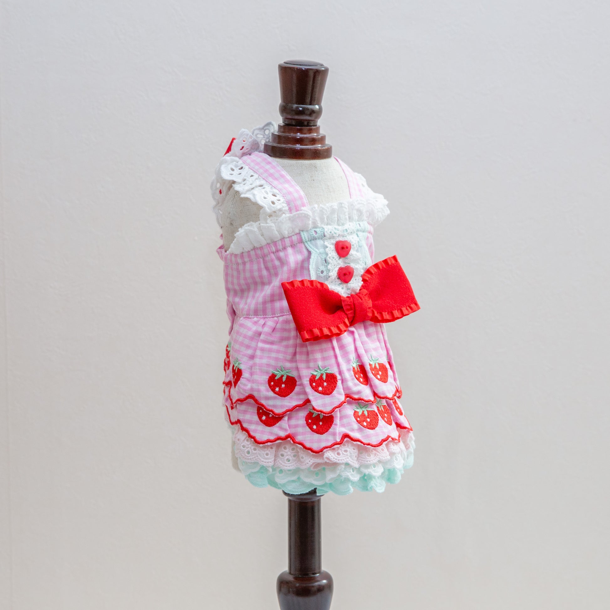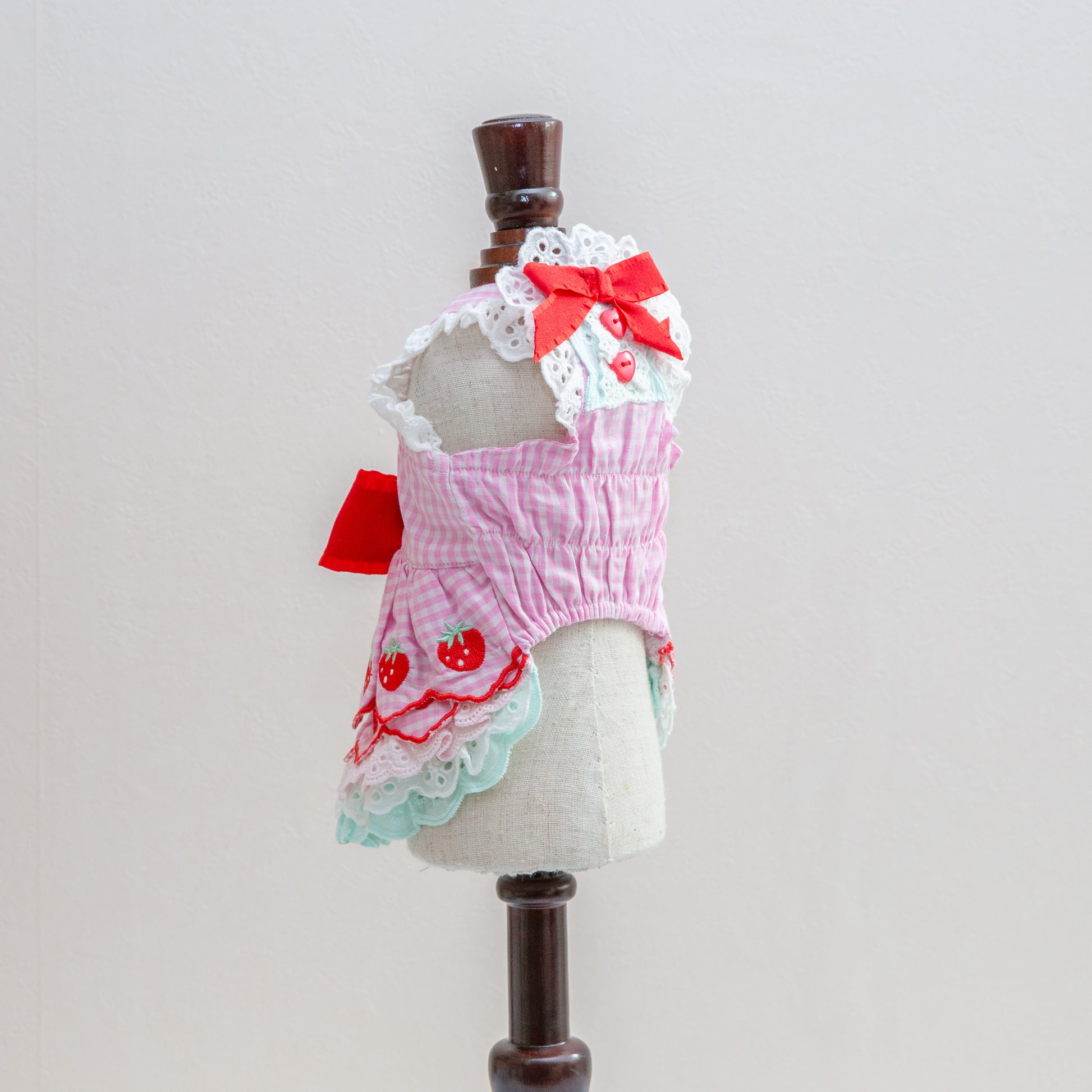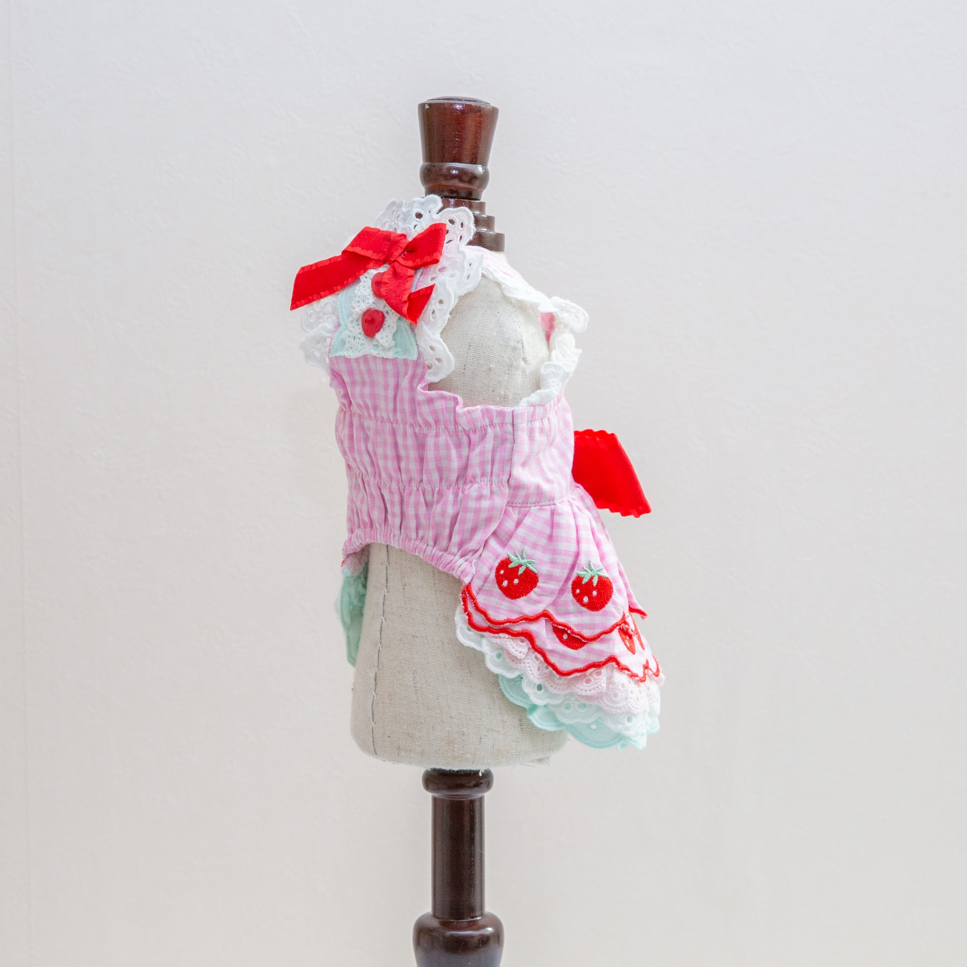ふんわりコットン素材にレースをあしらった、いちごモチーフの可愛らしいワンピース。愛犬のおしゃれを引き立てる優しい風合いと、遊び心あふれるデザインが特徴です。