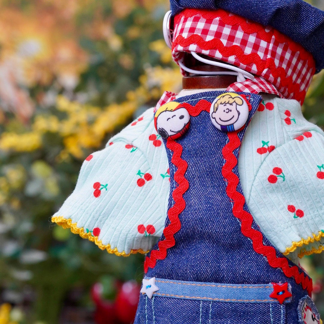 デニムエプロンはアンティークシーツから生まれたキャラクターボタンとパッチが、独自のヴィンテージ感を醸し出します。