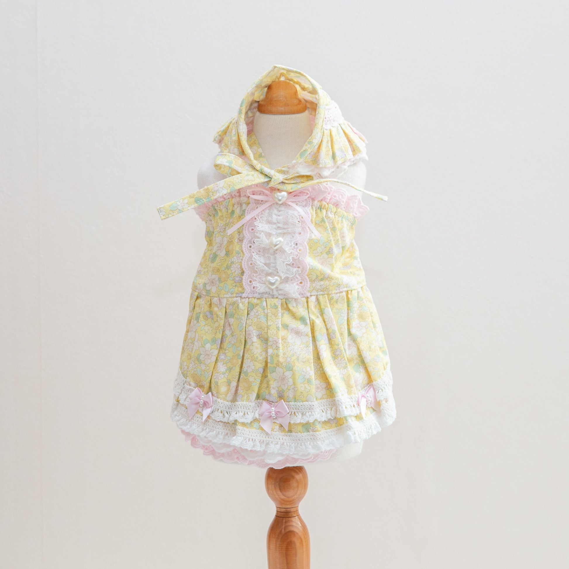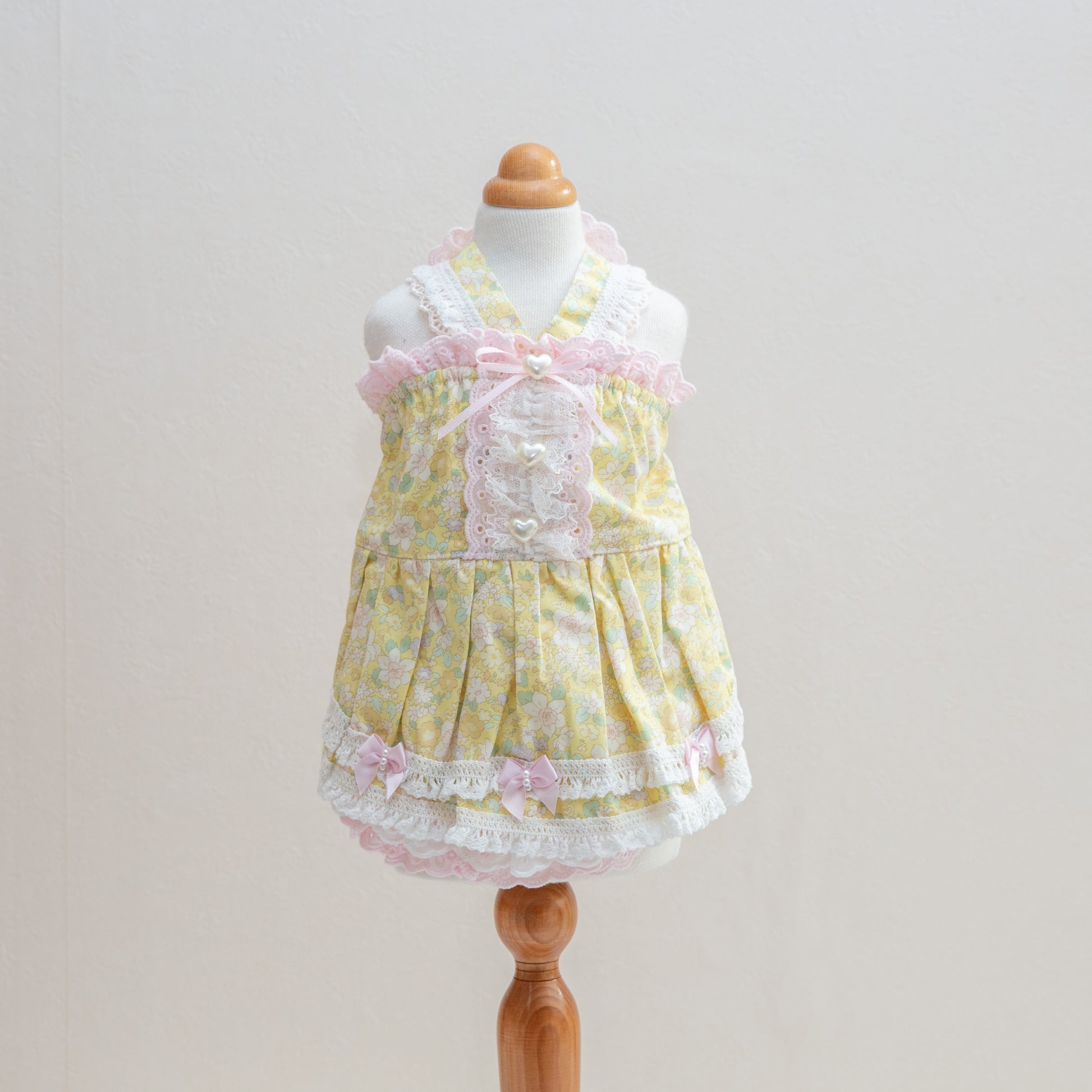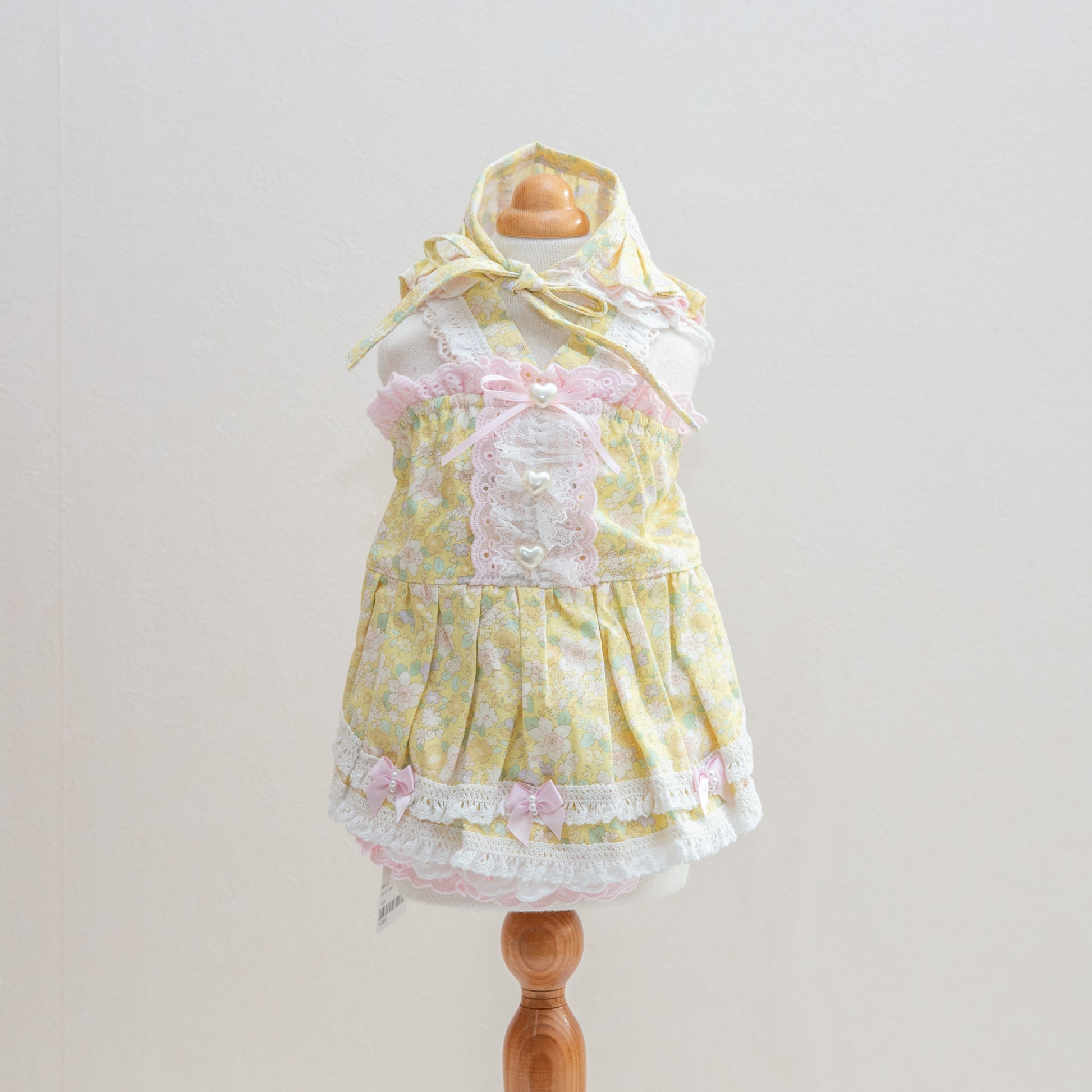 明るく元気なイエローカラーが目を引くワンピースセット。愛犬の個性を引き出す鮮やかな色合いと、着脱しやすい設計が嬉しいポイントです。