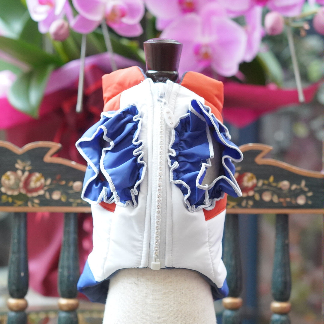 【Ruban d'or】のトリコロールダウンベストは、鮮やかなトリコロールカラーが目を引くキュートなデザイン。軽くて暖かく、テラヘルツ素材でさらに快適な着心地を実現。寒い日も元気におしゃれを楽しみたいあなたにぴったりの一枚です!