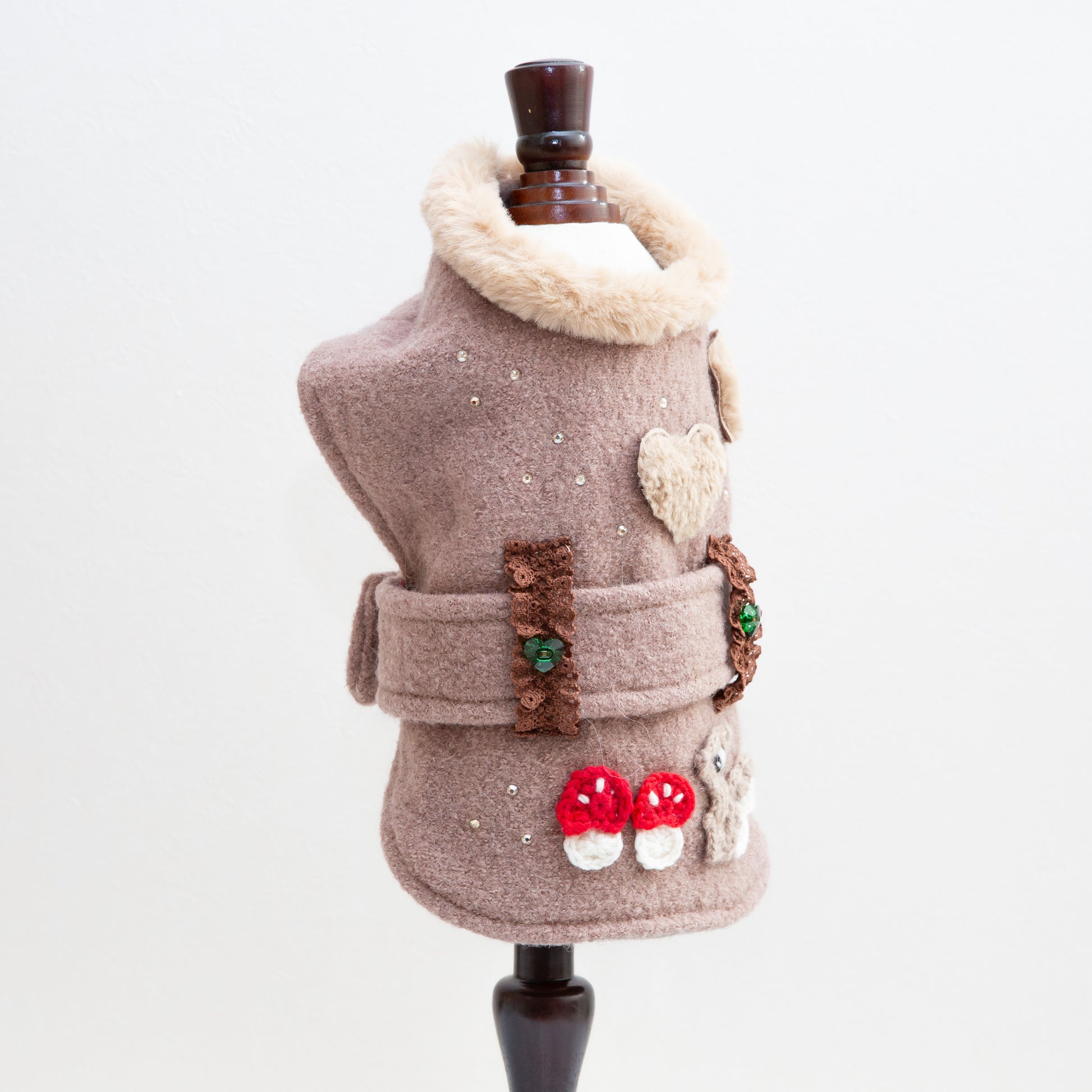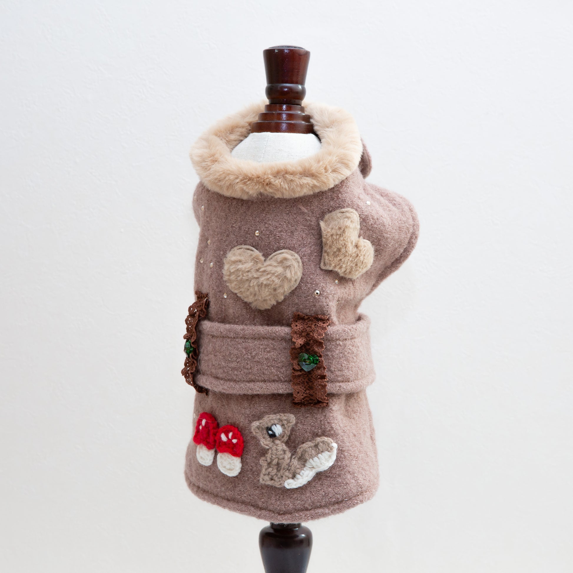 Trench Squirrel は、ぬくもりを感じるブラウン生地に、手編みのリス・きのこ・木のアップリケを散りばめた“森の物語”のようなトレンチコート。