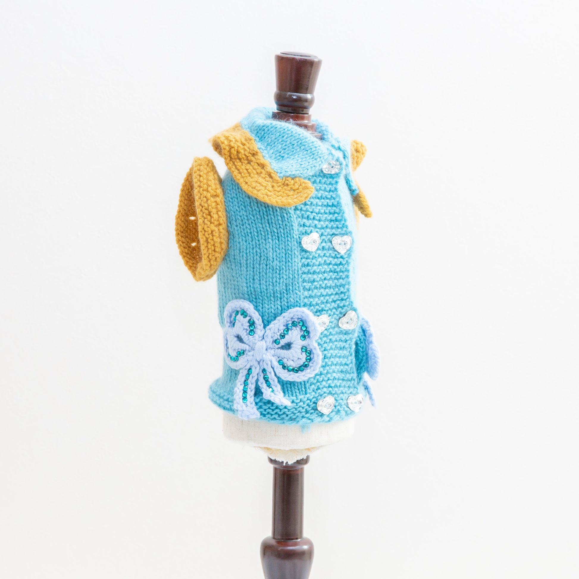 淡いブルーのニットに、手編みのダブルボタンとフラワーモチーフを組み合わせ、クラシカルで愛らしいデザインに仕上げました。