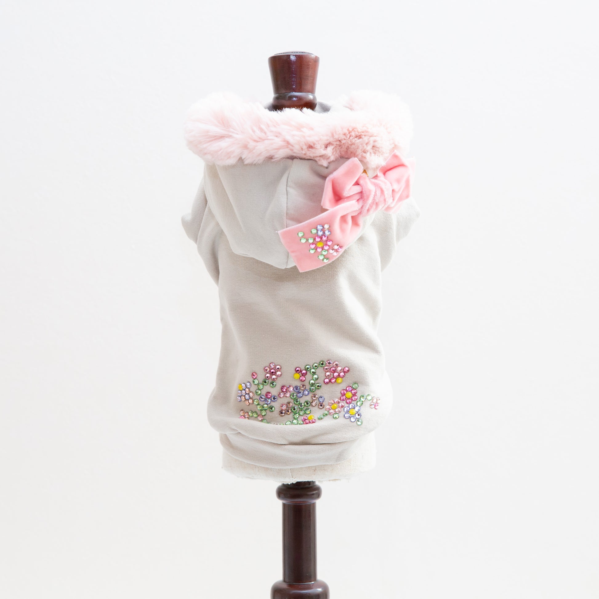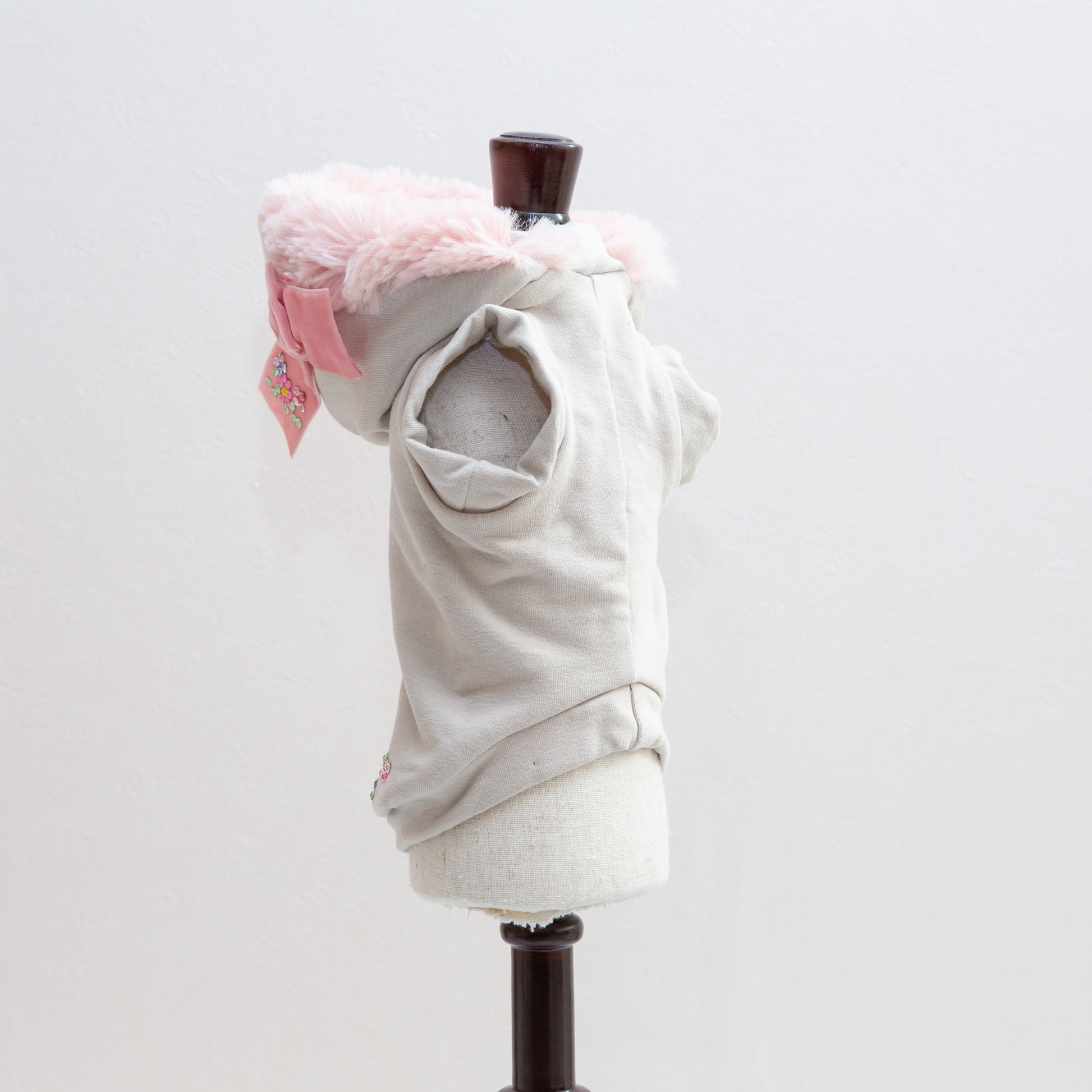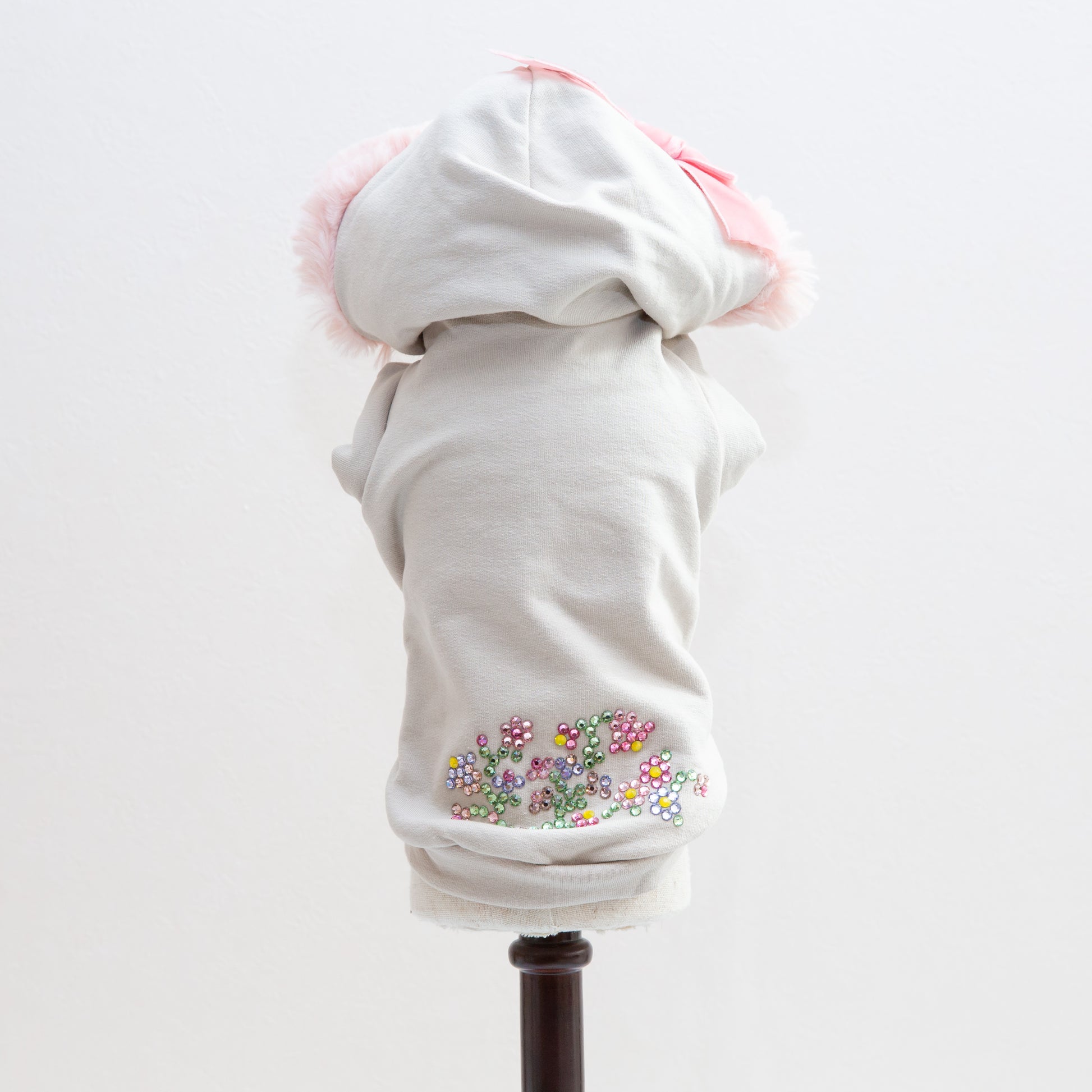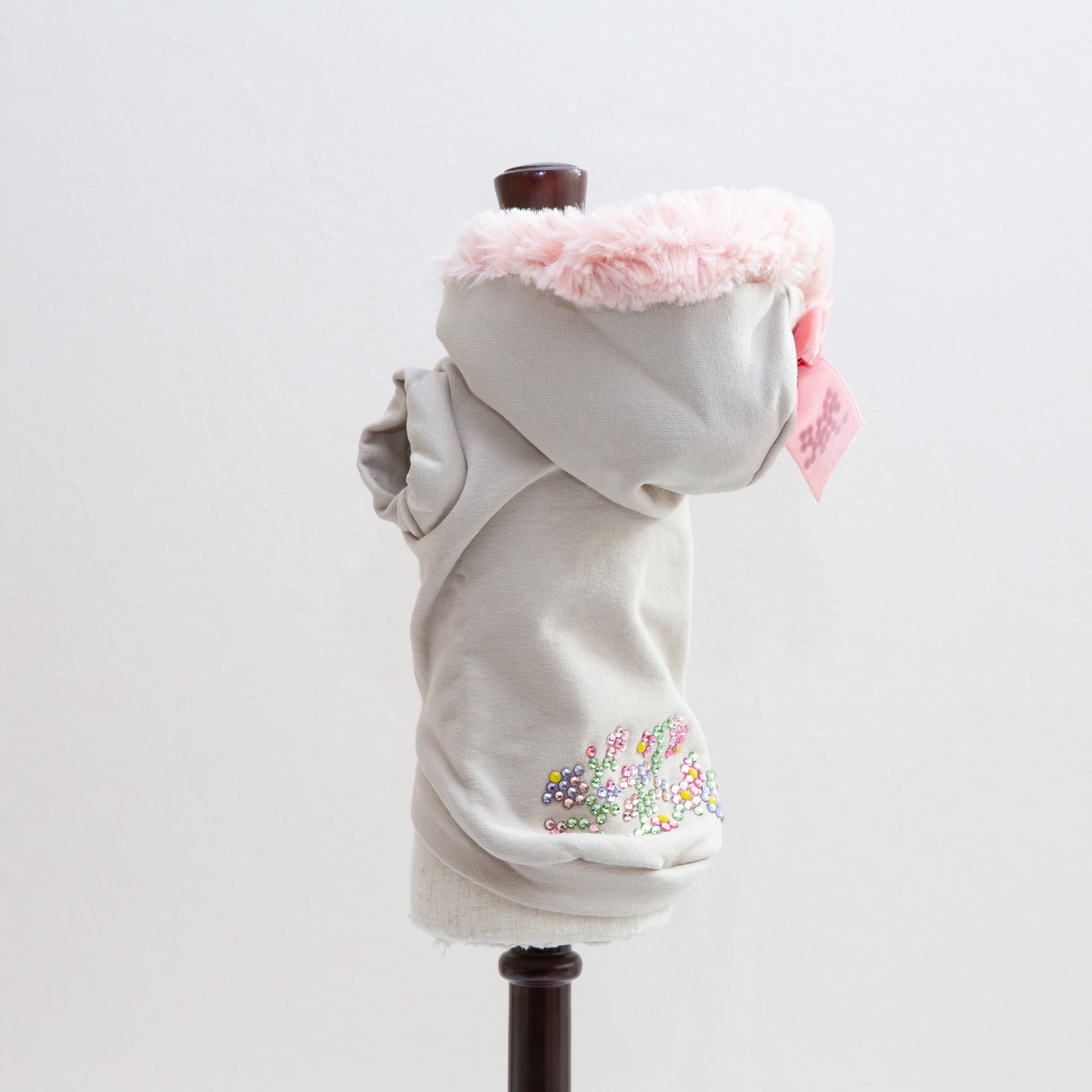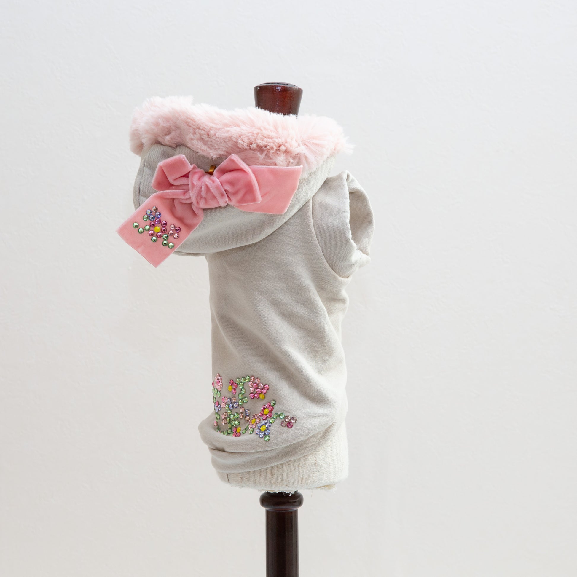 上質なスウェット素材が、ペットを心地よく包み込みながら、華やかなクリスタルの輝きが個性を引き立てます。フェイクファーの柔らかな質感で、寒い季節も快適に過ごせます。